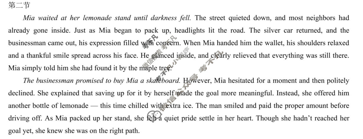 资源详情:石家庄市2025届普通高中学校毕业年级教学质量检测(石家庄二模)(二)2英语答案 中内容包括《石家庄市2025届普通高中学校毕业年级教学质量检测(石家庄二模)(二)2英语答案》请在考不凡上搜索。石家庄市2025届普通高中学校毕业年级教学质量检测(二)英语参考答案听力(20×1.5=30):1-5BACBA6-10CBCBA11-15CBBAA16-20CCACB阅读(20×2.5=50):21-23BAC24-27BDBA28-31ADCD32-35CDBC36-40AECDB完形填空(