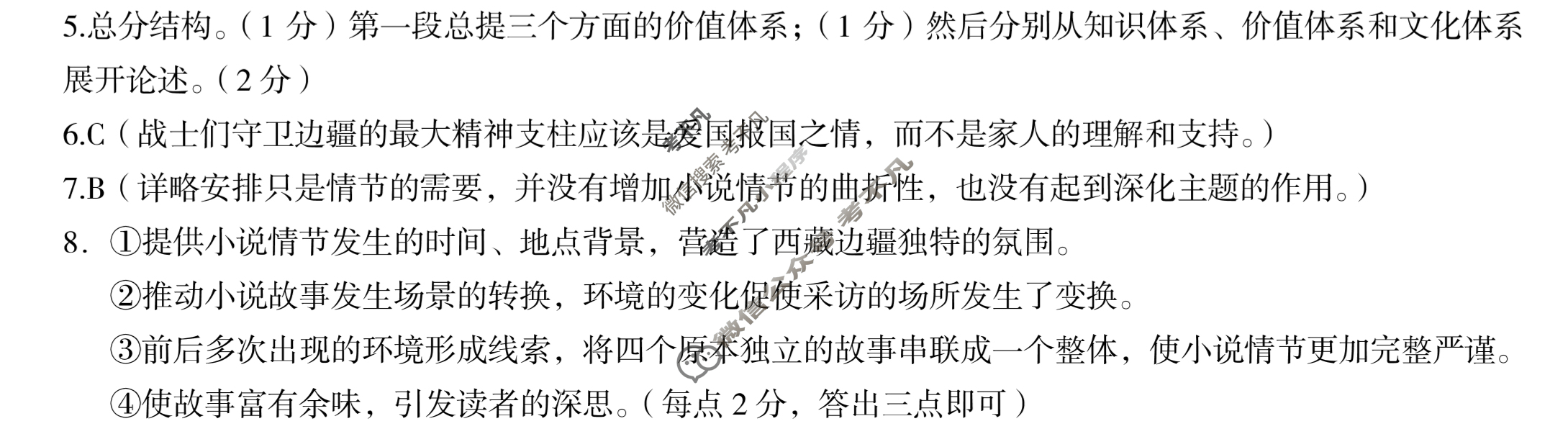 资源详情:安徽省2022~2023学年度第一学期高二年级12月份联考(新教材)语文答案 中内容包括《安徽省2022~2023学年度第一学期高二年级12月份联考(新教材)语文答案》请在考不凡上搜索。高二语文参考答案题号23671011答案CD0B1B题号121521答案BCD1.C(《论语》中称呼的使用,并不是“孔子”,偷换了概念。)2.D(“中华民族的信仰就是《论语》为我们建立的”文本中没有依据。)3.D(A是知识体系,B是《论语》的作用,C是《论语》的价值体系。)4.①《论语》本身包含“雅”