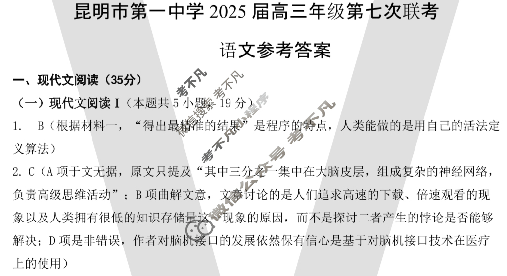 资源详情:昆明市第一中学2025届高三年级第七次联考(2月)语文答案 中内容包括《昆明市第一中学2025届高三年级第七次联考(2月)语文答案》请在考不凡上搜索。昆明市第一中学2025届高三年级第七次联考语文参考答案一、现代文阅读(35分)(一)现代文阅读I(本题共5小题,19分)1.B(根据材料一,“得出最精准的结果”是程序的特点,人类能做的是用自己的活法定义算法)2.C(A项于文无据,原文只提及“其中三分之一集中在大脑皮层,组成复杂的神经网络,负责高级思维活动”;B项曲解文