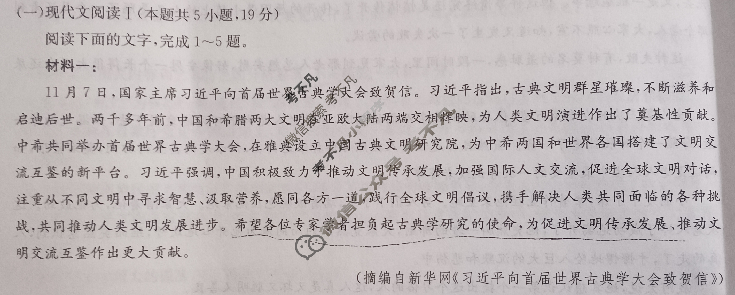 资源详情:[全国名校大联考]2024~2025学年高三第六次联考(月考)试卷语文试题 中内容包括《[全国名校大联考]2024~2025学年高三第六次联考(月考)试卷语文试题》请在考不凡上搜索。2024~2025学年高三第六次联考(月考)试卷语文考生注意:1.本试卷满分150分,考试时间150分钟。2答题前,考生务必用直径0.5毫米黑色墨水签字笔将密封线内项目填写清楚。3考生作答时,请将答案答在答题卡上。选择题每小题选出答案后,用2B铅笔把答题卡上对应题日的答案标号涂黑:非选择题请用直径0,5