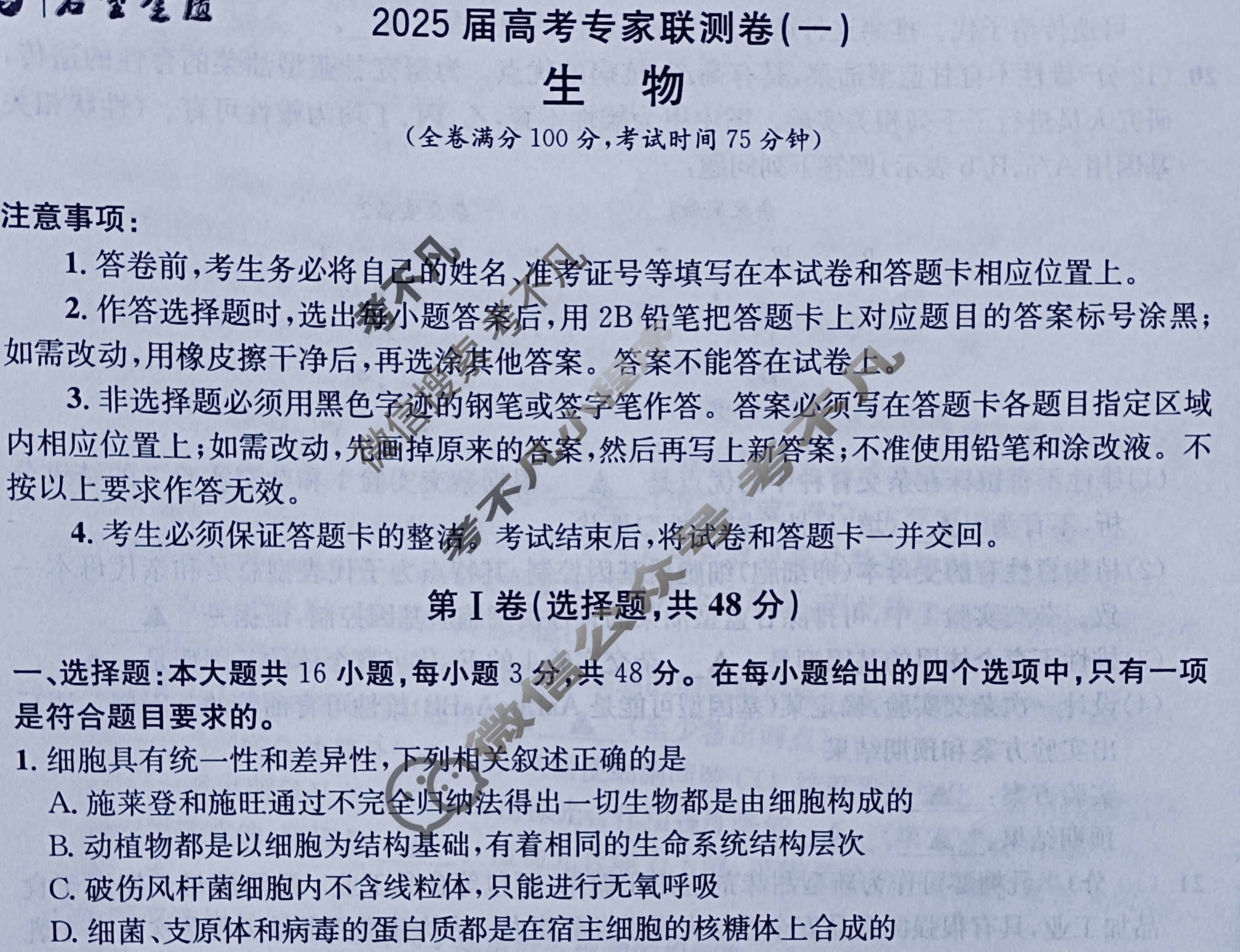 分类:2025届,专家联测卷,一,生物,石室金匮